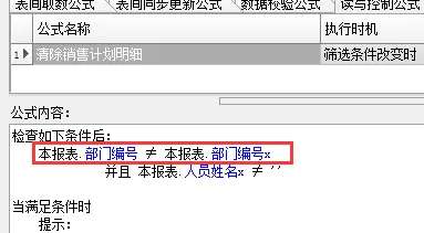 那第二个条件 “人员姓名”不为空,是为了避免另一种情况:当我们新填表,刚填到销售部门时,人员还没选,这时明细表中的部门编号和主表中的部门编号,也是不一致的,这种情况下,没有必要执行这个公式。
