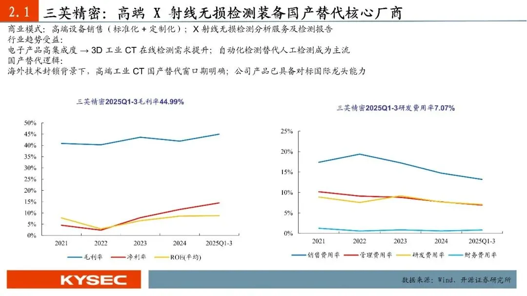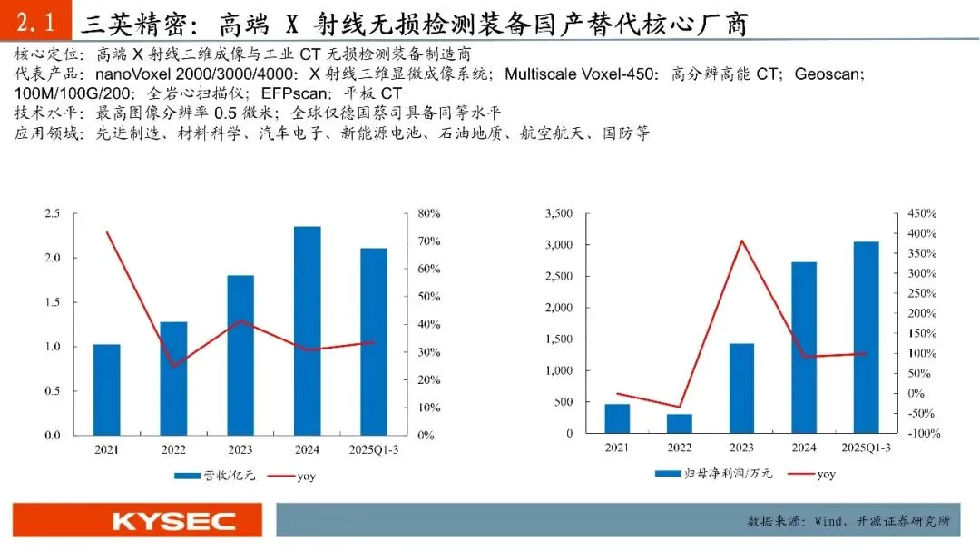 三英精密(839222.NQ):高端X射线无损检测装备“小巨人”。公司自主研发的 X射线三维显微镜和工业 CT设备,最高图像分辨率可达到 0.5微米,目前全球范围内仅德国蔡司可以达到同等水平。