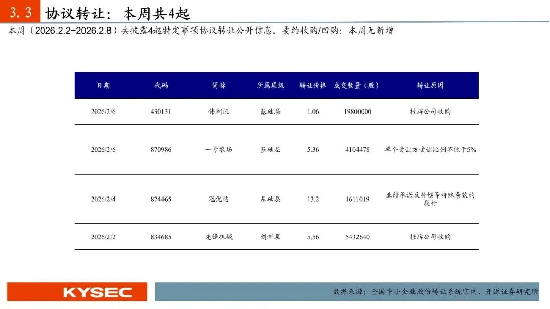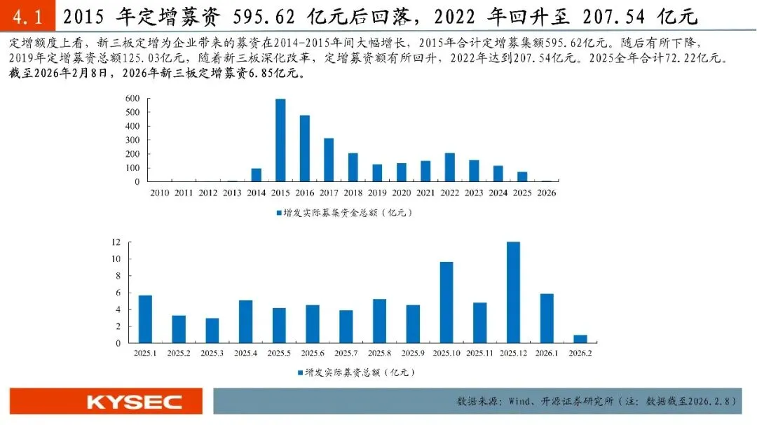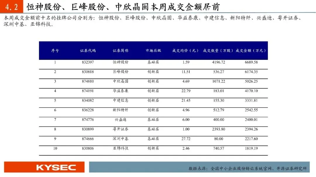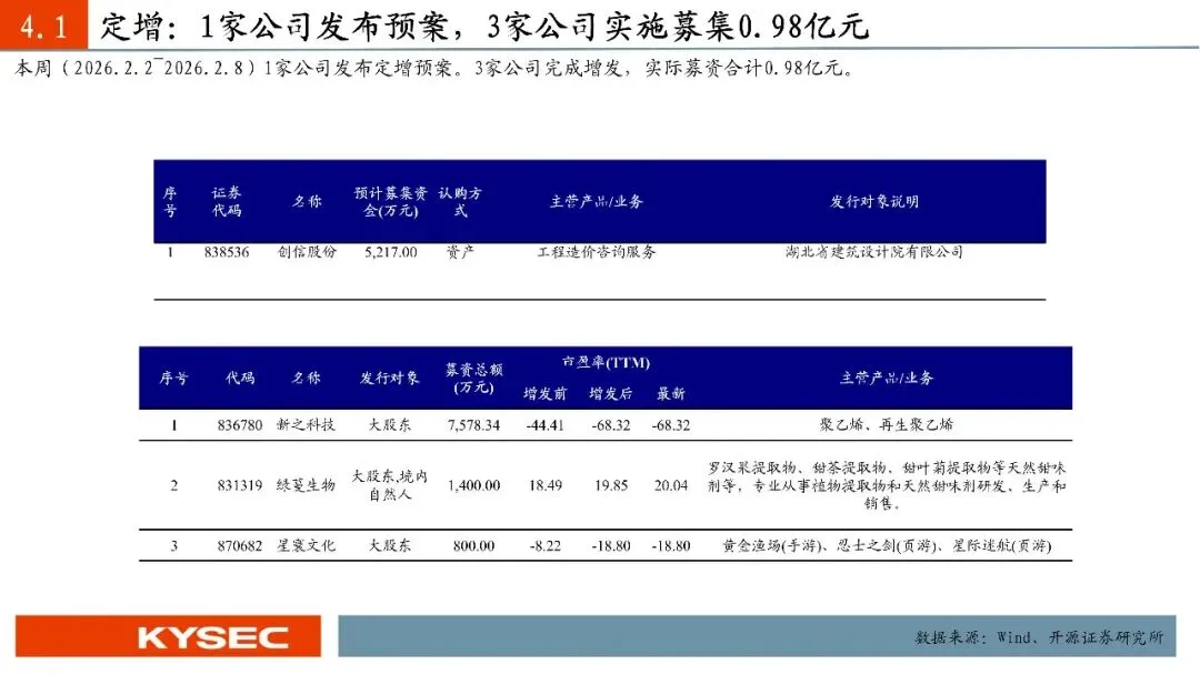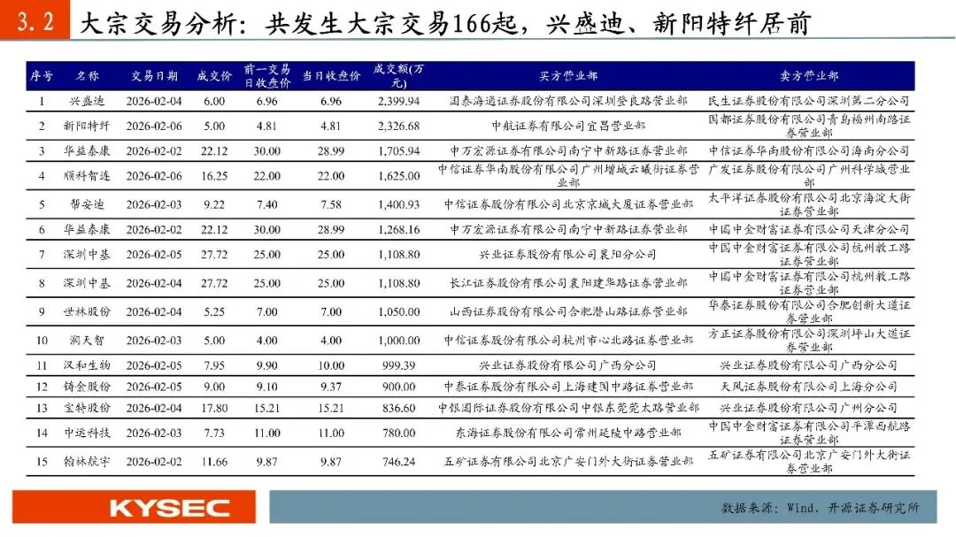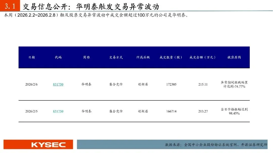 华明泰2026年2月5日与6日两次触发股票交易异常波动;本周共发生大宗交易166起。兴盛迪、新阳特纤交易金额居前;披露4起特定事项协议转让公开信息。1家公司发布定增预案。3家公司完成增发,实际募资合计0.98亿元。截至2025年1月31日,新三板挂牌公司总市值25843.18亿元,环比+2.63%,市盈率18.24倍。截至2026年2月8日,2026年新三板定增募资6.85亿元。本周成交金额前十名的挂牌公司分别为:恒神股份、巨峰股份、中欣晶圆、华益泰康、中建信息、新阳特纤、兴盛迪、粤开证券、深圳中基、亚锦科技。
