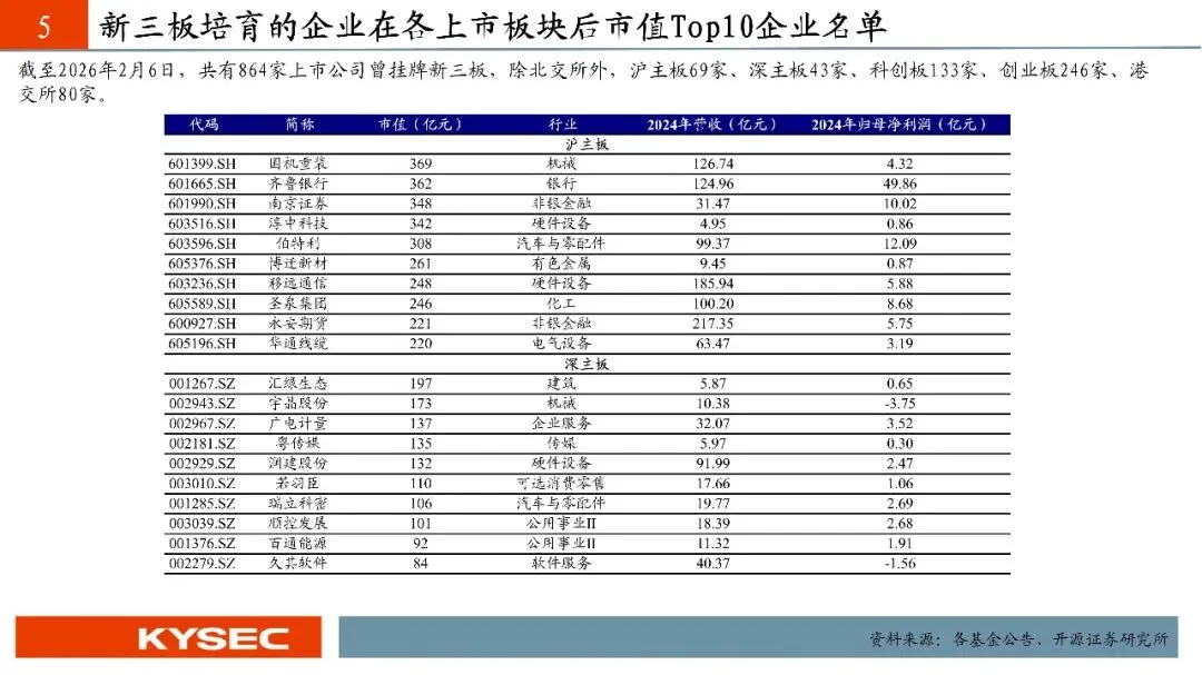 中国资本市场已形成了包括沪深主板、科创板、创业板、北交所、新三板以及区域性股权交易市场等在内的多层次市场体系,呈现出明显的递进结构与差异化定位。全国中小企业股份转让系统(“新三板”)是中国多层次资本市场的重要组成部分,为众多中小企业提供挂牌展示、股权融资等服务。截至2026年2月8日,新三板合计向沪深北及港交所共计输送864家企业。