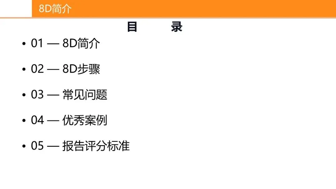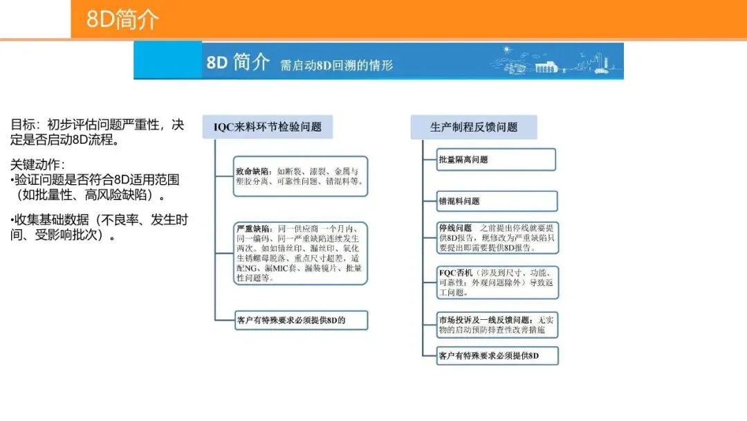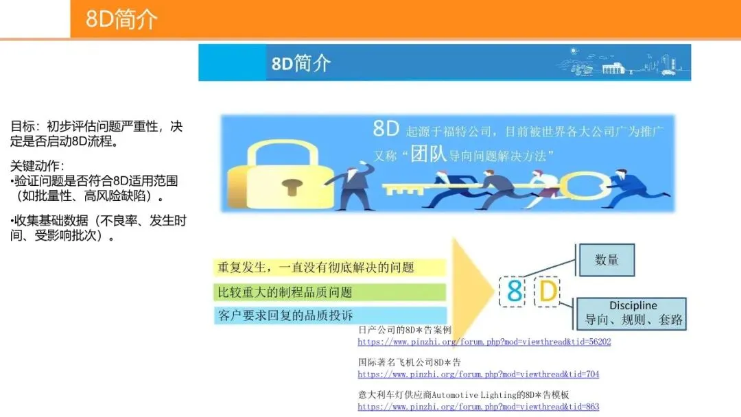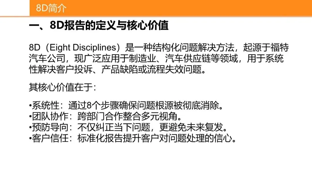 8D(Eight Disciplines)是一种结构化问题解决方法,起源于福特汽车公司,现广泛应用于制造业、汽车供应链等领域,用于系统性解决客户投诉、产品缺陷或流程失效问题