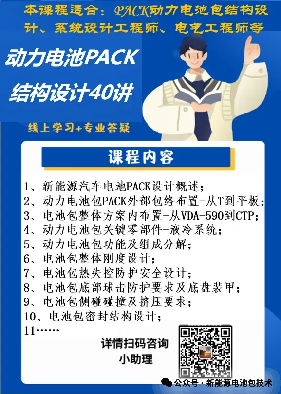 该课程是全网唯一系统层级的PACK设计教程,从零部件开发到结构设计校核一系列课程,重点关注零部件设计、热管理零部件开发、电气零部件选型等,让你从一个小白从零开始入门学习新能源电池包设计。