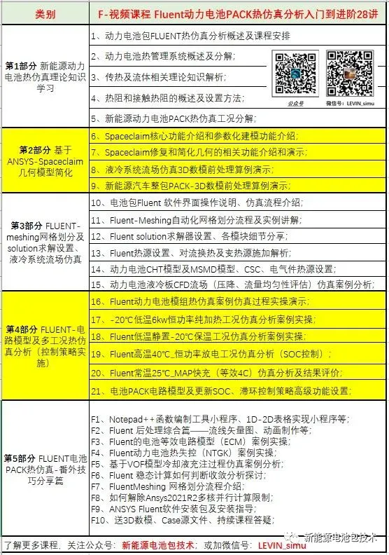回馈新老新能源人,(新能源电池包技术)公众号特惠,为方便大家提升,限量50份半价出售全套《新能源电池包PACK设计入门到进阶30讲+免费能分享篇》、《Fluent新能源电池包PACK热管理仿真入门到进阶28讲+番外篇》视频课程,并送持续答疑!了解更多课程,加微信号详询:LEVIN_simu