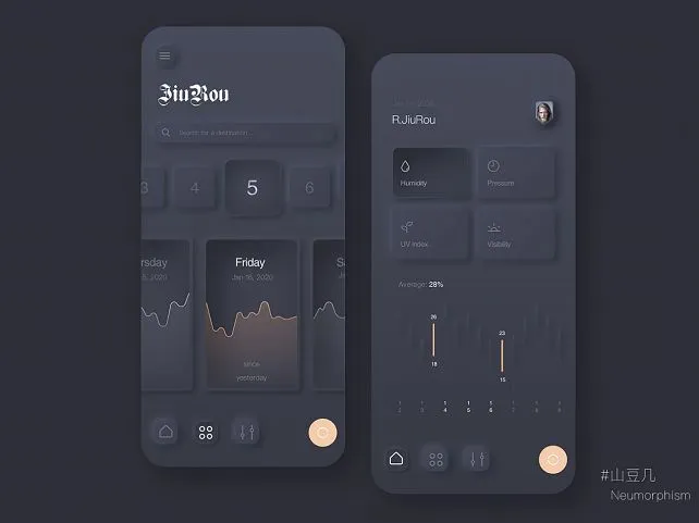 需要注意的是,新拟态并不适合在高光的场景下使用,因为新拟态的色彩对比度不高,高亮度的场景下使用会对页面内容的展示产生较大影响。