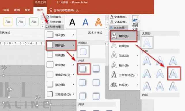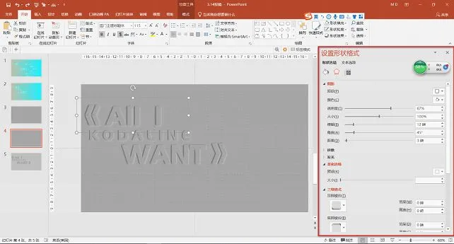 阴影的大小分别在【设置形状格式】和【设置文字效果格式】中进行具体的调节。(注意,一边的阴影设置为浅色,另一边设置为深色。)