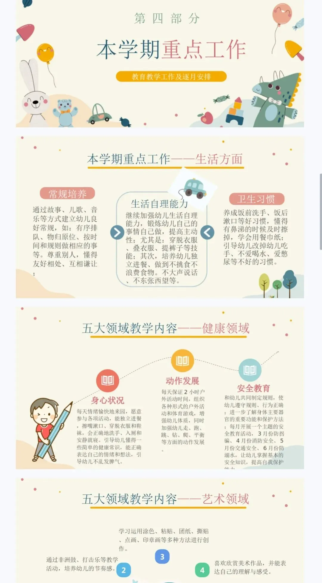 本学期我们仍以五大领域为主开展教学活动,五大领域即为:语言领域、音乐领域、健康领域、社会领域和科学领域,同时结合主题活动和区域活动促进孩子全面发展。根据孩子上学期发展情况,将本学期五大领域教学目标及内容制定如下:
