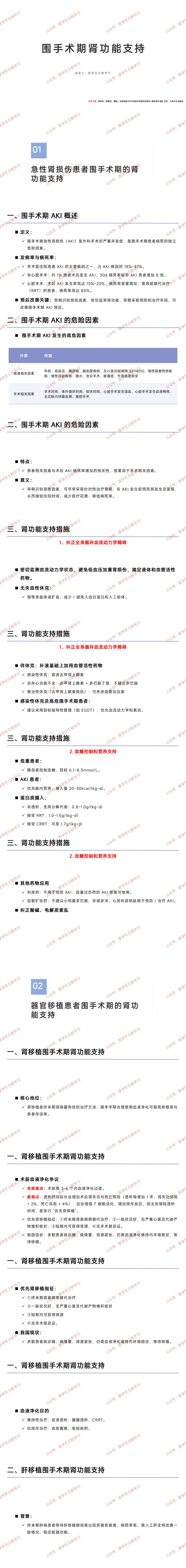 - 术后 AKI 特点:发生率 2%~5%,病死率 40%~80%,为术后死亡独立预测因素;诱因包括体外循环肾灌注不足、肾缺血、溶血、低血压、肾毒性药物等。