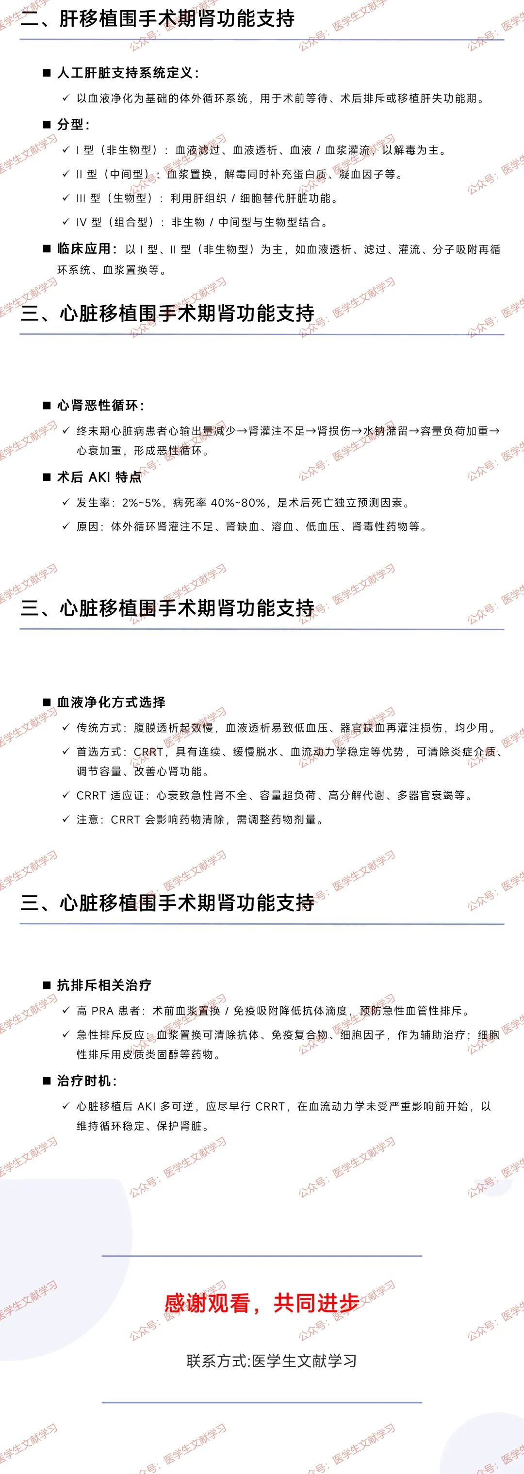 - 抗排斥治疗:高 PRA 患者术前用血浆置换 / 免疫吸附降低抗体滴度,预防急性血管性排斥;急性排斥反应时,血浆置换可清除抗体、免疫复合物等(辅助治疗),细胞性排斥用皮质类固醇等药物;AKI 多可逆,应尽早启动 CRRT。