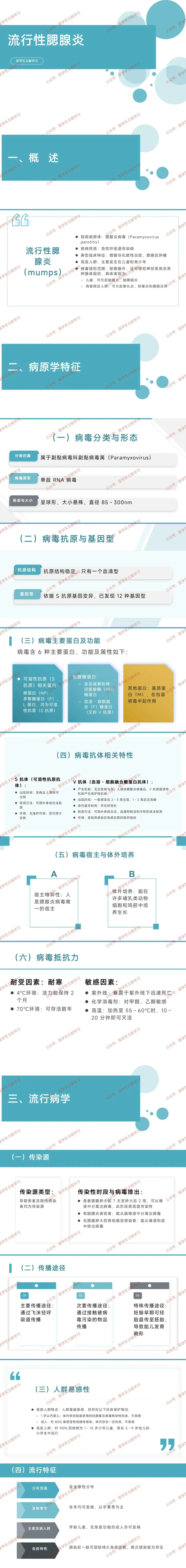 传染性时段与病毒排出:患者腮腺肿大前 7 天至肿大后 2 周,唾液中可分离出病毒(具高度传染性);有脑膜炎表现者脑脊液中可分离出病毒;无腮腺肿大的其他器官感染者,唾液和尿中可排出病毒