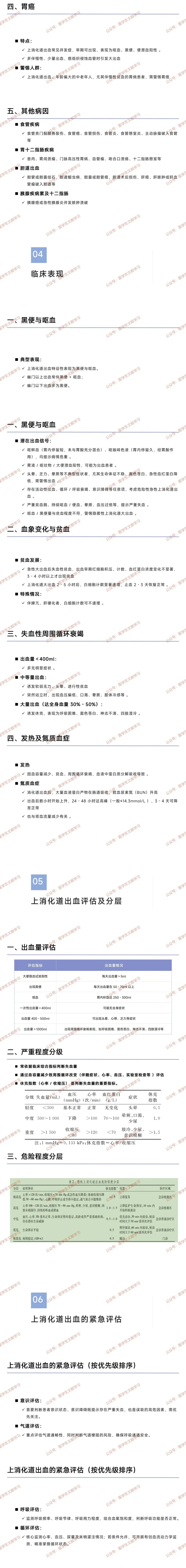 - 出血量评估:大便隐血试验阳性提示每天出血>5ml;黑便提示每天出血 50-70ml 以上;呕血提示胃内积血 250-300ml;一次性出血<400ml 可能无全身症状,400-500ml 有头晕等症状,>1000ml 出现周围循环衰竭表现。