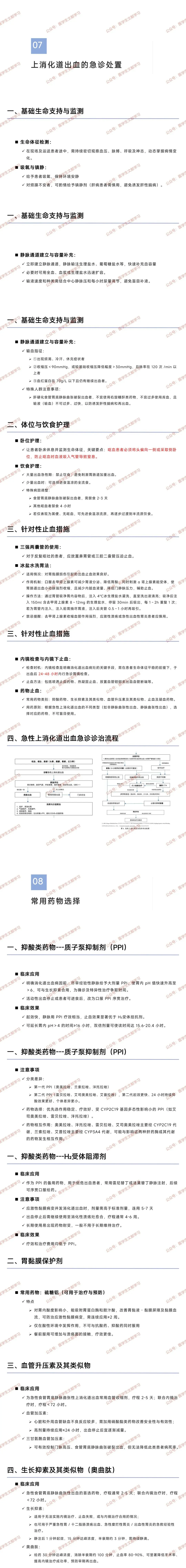- 急诊诊治流程:出现症状后,先询问病史、查体,做潜血试验诊断;紧急评估后,有危险出血情况则抢救分层救治(监护、气道保护等),极低风险出血则门诊诊治;全面评估后,根据血流动力学情况和胃镜禁忌与否,选择保守治疗、内镜治疗等;明确病因后针对性处理,病因不明或治疗无效则进一步检查或多学科诊治,最后进行预后评估和随访。