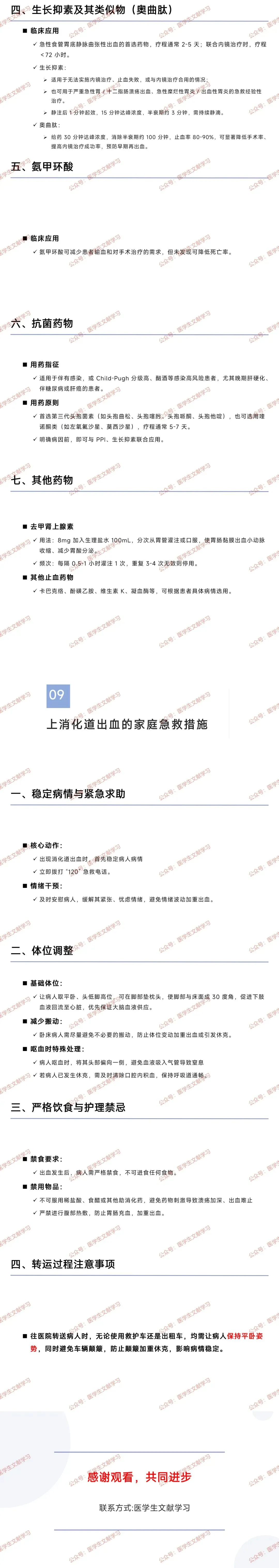 - 生长抑素及其类似物(奥曲肽):急性食管胃底静脉曲张出血首选,疗程 2-5 天,联合内镜治疗时<72 小时;生长抑素适用于多种情况,静注后起效快但半衰期短,需持续静滴;奥曲肽达峰浓度时间和半衰期较长,止血率高,可降低手术率等。