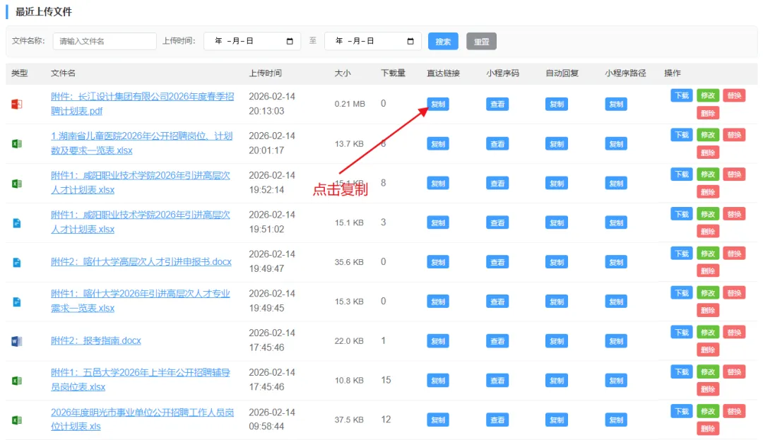 复制链接在文件管理页找到已上传的文件,点击“一键复制粘贴”或“直达链接”,复制生成的链接地址。