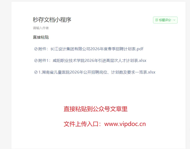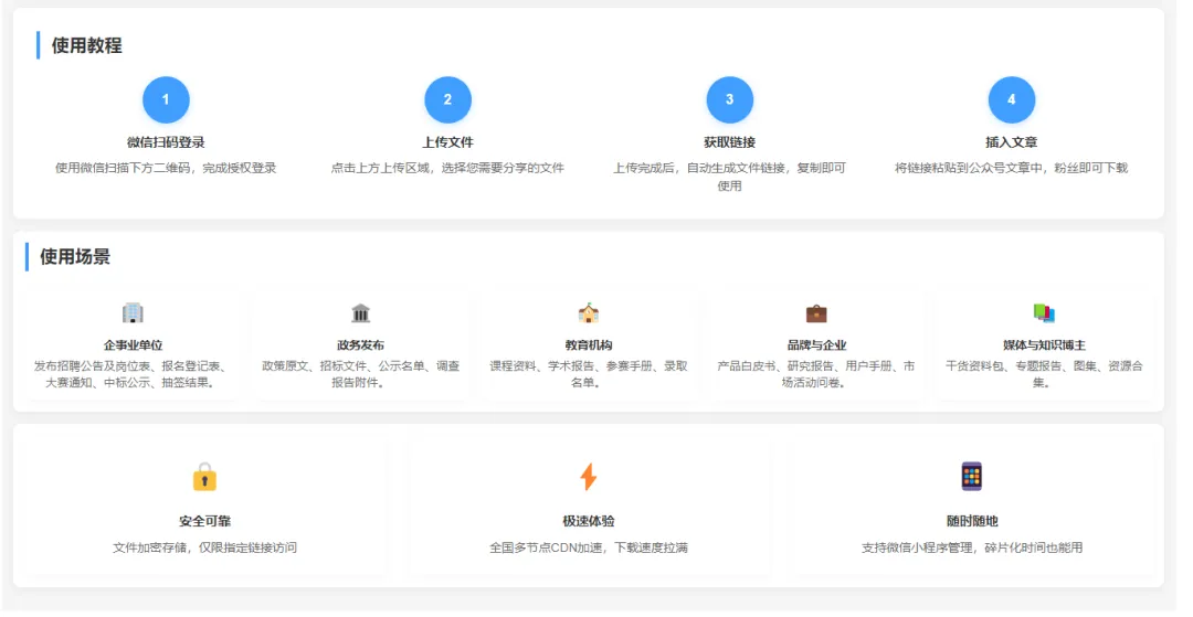 📢 使用场景:适用于公众号中插入各种文档(招聘岗位表、报名表、公示名单、报告、文件资料)等Word、Excel、PDF、PPT、ZIP等附件,用户可在线预览、下载分享!