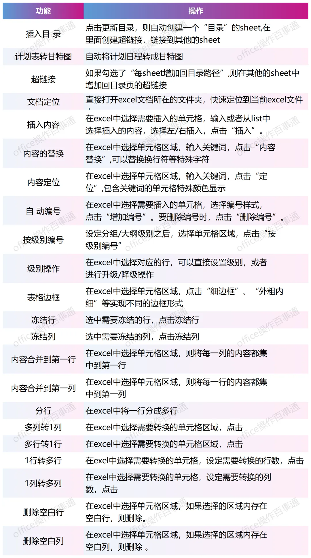 不仅如此,该助手还涵盖多项实用办公功能,包括计划表转成甘特图、自动生成清晰目录、灵活的分组与大纲处理、单元格内外编号自动化、文本内容的分行与分列整理、一键删除空白行、批量清除首尾多余空格、快速插入指定内容、自如合并与拆分单元格、指定数据区域的快速统计与可视化展示,甚至支持将单元格数据一键转换为Visio图表。