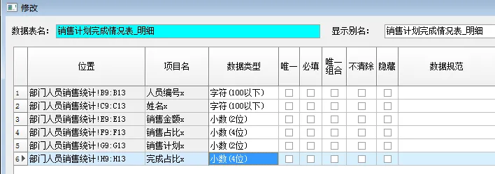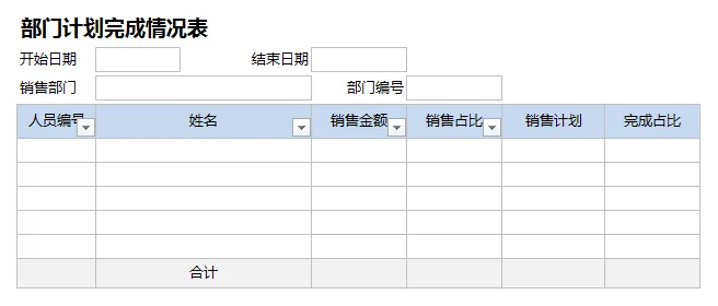 明细表共有六个字段,人员编号,姓名,销售金额,销售占比,销售计划,完成占比。