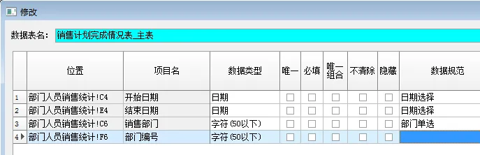 主表共有四个字段,开始日期,结束日期,销售部门,部门编号