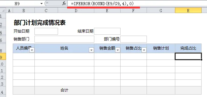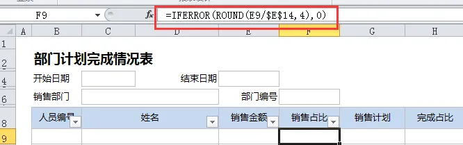在“销售占比”和“销售计划完成占比”列使用了Excel公式。