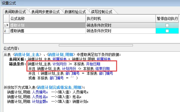 这条公式中,我们要注意的是销售计划主表中的“计划月份”虽然名字是“月份”,但其实他是个日期值,是每个月的期初,也就是每月1日。所以在这儿用作判断条件是没有问题的。