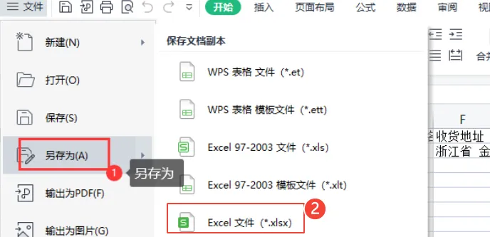 - 点击"文件" → "另存为" → 选择"Excel文件(.xlsx)"