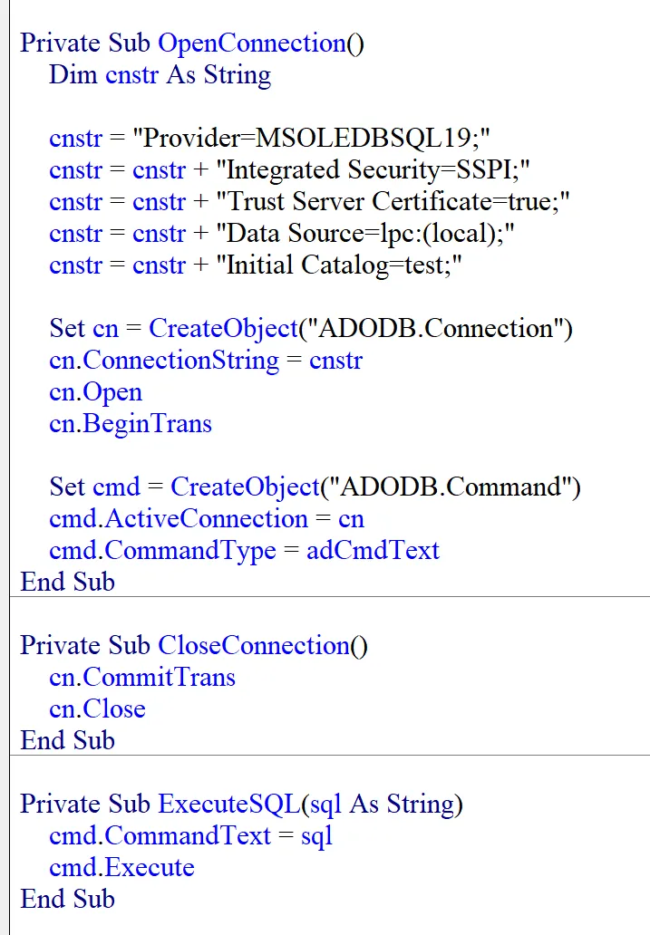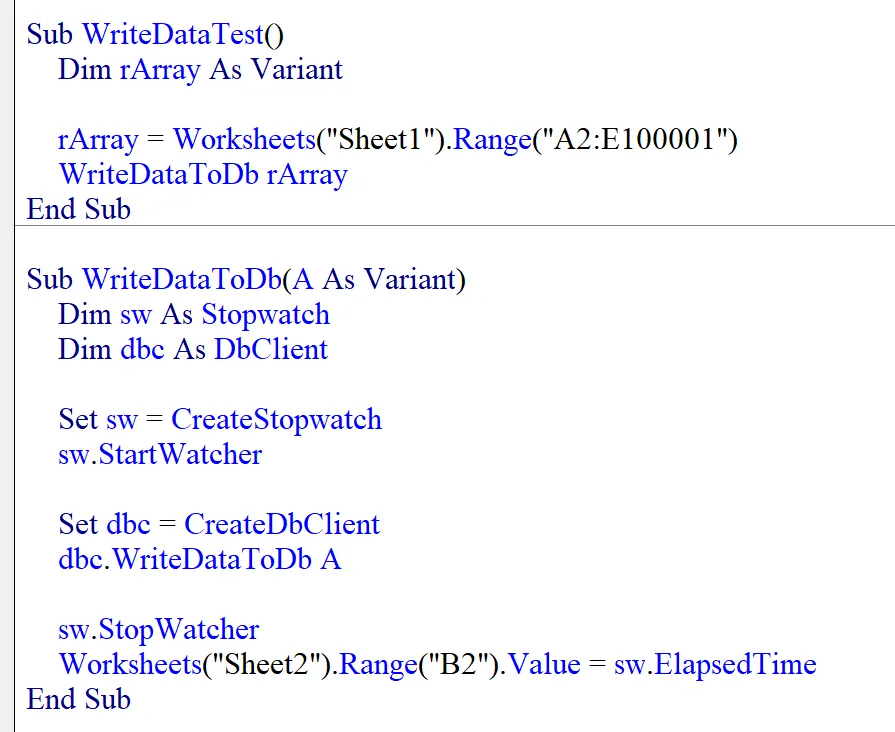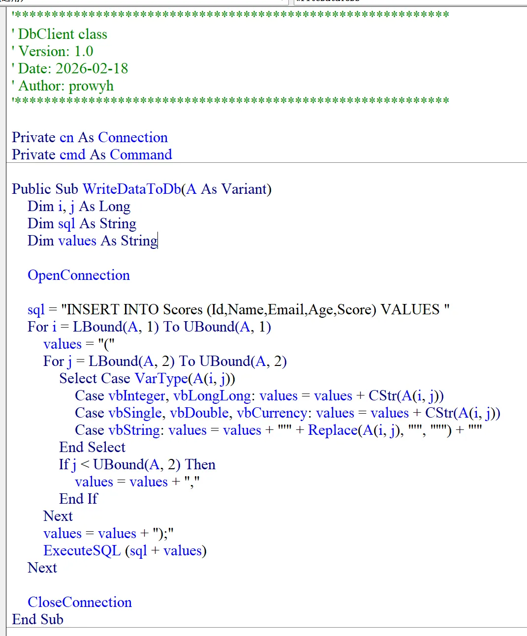 在《Excel 编程 -- 访问数据库》篇,有朋友问:有没有一次性上传数据库的办法?遍历数据太慢。为研究这个问题,先通过网络生成了一个含有 10 万条记录、每条记录 5 个字段的 Excel 数据表,如下图所示:然后分别利用 VBA、Delphi、Python/Pandas 将这 10 万条记录的 Excel 数据表写入 SQL Server 2025 数据库,得到三种方式所花费的时间(单位:秒)如下:由于 VBA 和 Delphi 都是通过 ADO 与数据库打交道,而且都是通过 Excel 获取数据,因此所花时间差不多,所差的那点时间可能就是 Delphi 编译为本机代码所带来的性能提升。相反,Python/Pandas 是通过 OpenPyxl 直接读取 Excel 文件,并且通过 ODBC 与数据库沟通,因此性能提升非常明显。今天我们先来看如果通过 VBA 代码将这 10 万条记录写入数据库。WriteDataTest 过程是最顶层的测试代码,这个过程的功能是将 10 万条记录所在的 Range 转换为数组 rArray,然后用这个数组调用 WriteDataToDb。WriteDataToDb 过程用了两个类模块,一个是先前定义的 Stopwatch,用来统计代码的执行时间。另一个是今天我们定义的 DbClient,用来与数据库打交道。关于类模块的实例化方式,昨天已经讨论过。在 PiVBALib 中定义了两个 Create 函数,分别创建 Stopwatch 和 DbClient 类的实例。DbClient 类中定义了一个 WriteDataToDb 的方法,用前面的数组作为参数,将该数组表示的数据集写入数据库。Stopwatch 用来统计执行时间,并将结果写入 Sheet2 的 B2 单元格。在进入 DbClient 的讨论之前,先来看在 PiVBALib 的过程模块中创建的 Create 函数:CreateStopwatch 和 CreateDbClient 分别用来创建类 Stopwatch 和 DbClient 的实例,以供外部代码使用。Stopwatch 类已经在前面的文章中讨论过了,今天主要讨论 DbClient。在 DbClient 类中,首先声明两个私有变量,分别是表示数据库连接的 cn 和表示执行 SQL 语句的 cmd。然后是 DbClient 呈现给外界的公有过程 WriteDataToDb,这个过程接受一个 Variant 类型的参数,实际是一个二维数组。如果传递过来的不是一个表示二维数组的 Variant 类型,则在程序执行过程中会出错(LBound 和 UBound 函数对于非数组类型的参数会出错)。WriteDataToDb 过程中的代码,首先是用 OpenConnection 打开与数据库的连接,然后遍历二维数组,每一行都生成一个 INSERT INTO 类型的 SQL 语句,向数据库表中插入一条记录。这个过程往复循环,直到遍历完所有的行。最后调用 CloseConnection 关闭数据库连接。下面看 OpenConnection、CloseConnection、ExecuteSQL 三个过程的实现代码:关于 Connection 和 Command,我们以前已经涉及过,但今天的不同在于“事务”这一概念。从上面的代码中可以看出,在 cn.Open 之后,我们写了 cn.BeginTrans,在 cn.Close 之前,我们写了 cn.CommitTrans。这表示,在 cn.Open 和 cn.Close 之间执行的所有 SQL 语句(10 万条记录就有 10 条 INSERT INTO 类型的 SQL 语句),都作为一个“事务”进行处理。作为一个事务进行处理的好处是能显著提升数据库的性能。相反,如果不将这 10 万条 SQL INSERT 语句作为一个事务,则默认每一条 INSERT 语句都是一个单独的事务,这将大大降低批量插入数据的性能。事务是数据库中一个很复杂的概念,今天只是简单涉及:将批量插入数据的 SQL 语句作为一个事务进行处理,能显著提升批量 SQL 语句的执行性能。