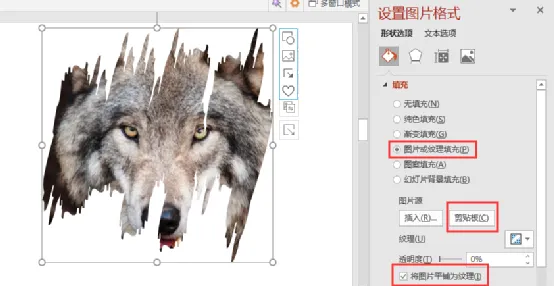 选中墨迹图形,右键设置形状格式——图片或纹理填充——剪贴板——将图片平铺为纹理,如下图所示: