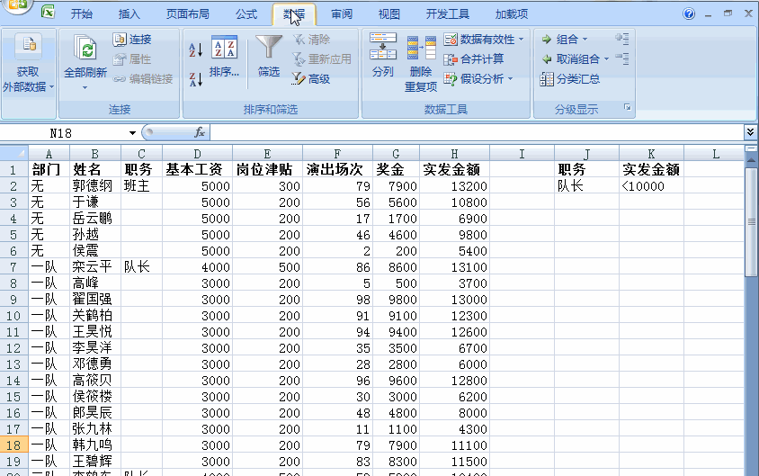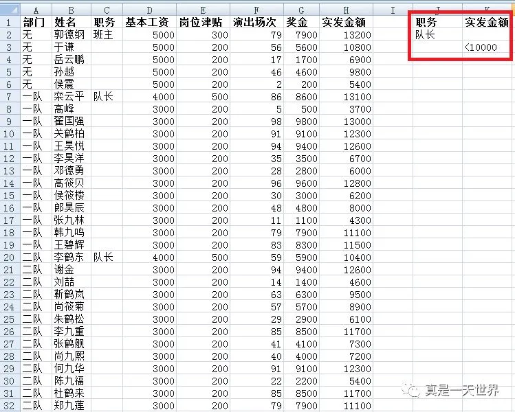 “职务”为“队长”,并且“实发金额”<10000 的人