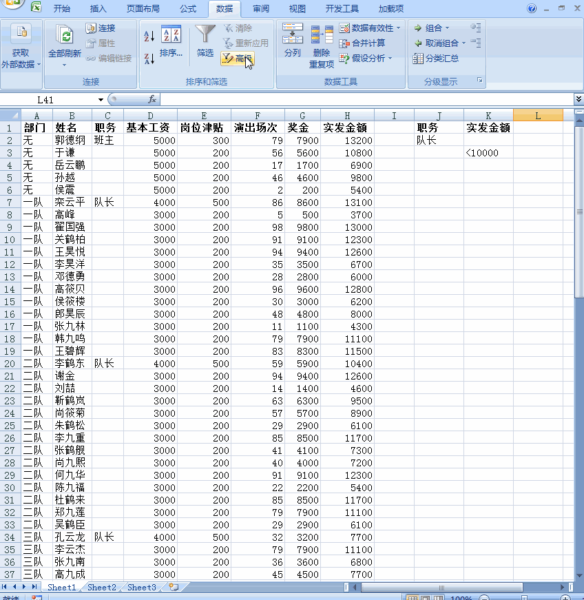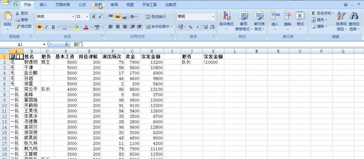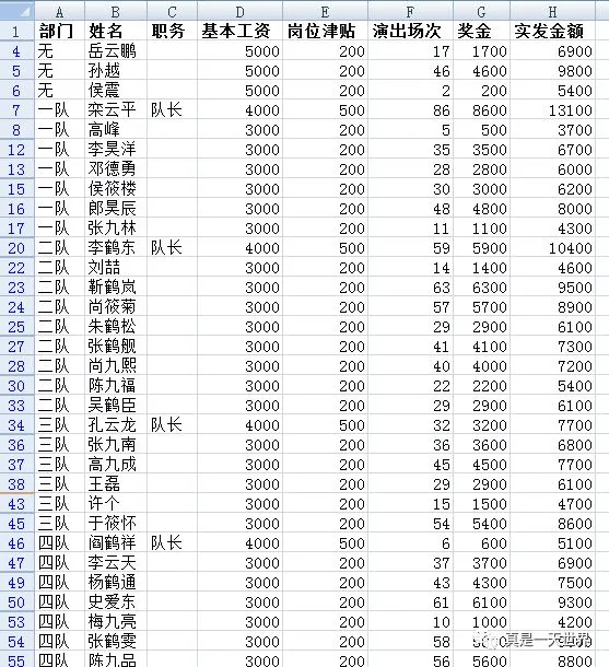 以下是德云社的工资表,请分别按以下条件筛选: