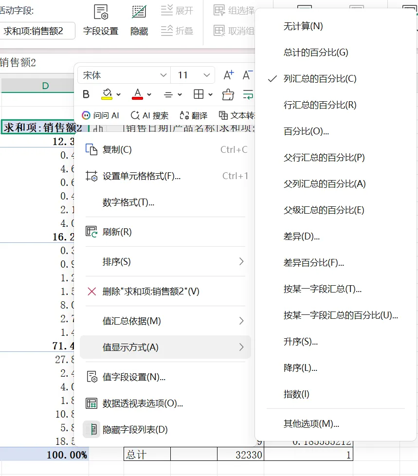 (4)把销售额托放在值的位置选择求和后(刚刚讲过了)(5)右键单击销售2,单击值显示方式,选择列汇总的百分比(6)选中表格键盘同时按住ctrl和C字母,右键鼠标选择在空白位置选择贴贴为数值,然后在开始选择所有框线。