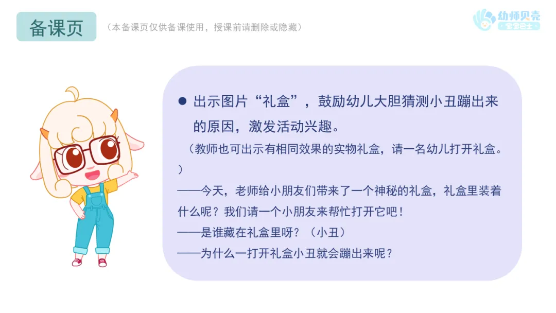 l出示图片“礼盒”,鼓励幼儿大胆猜测小丑蹦出来的原因,激发活动兴趣。
