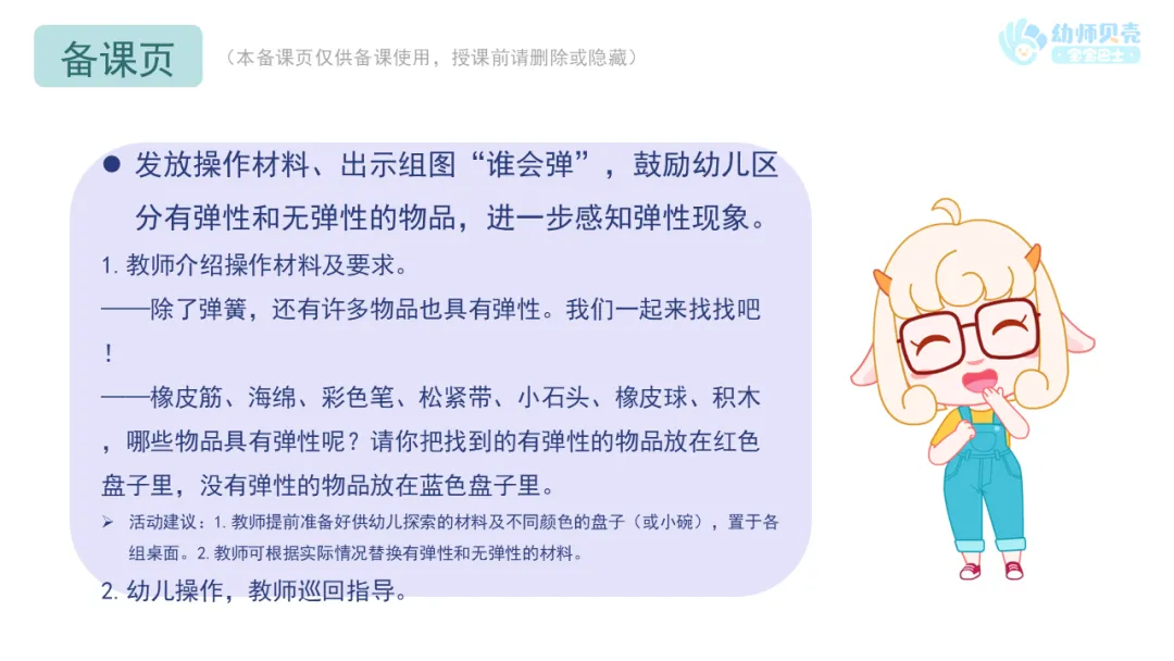l发放操作材料、出示组图“谁会弹”,鼓励幼儿区分有弹性和无弹性的物品,进一步感知弹性现象。
