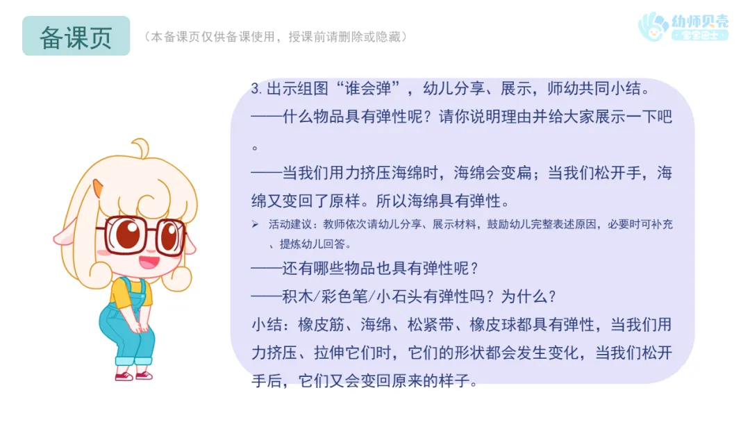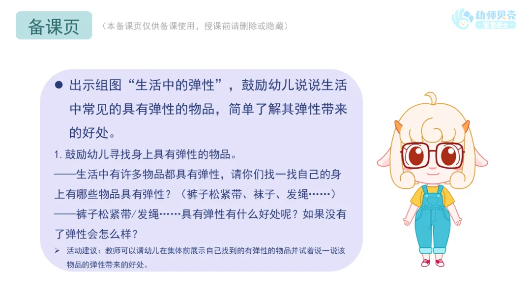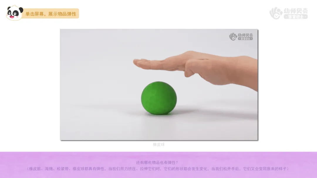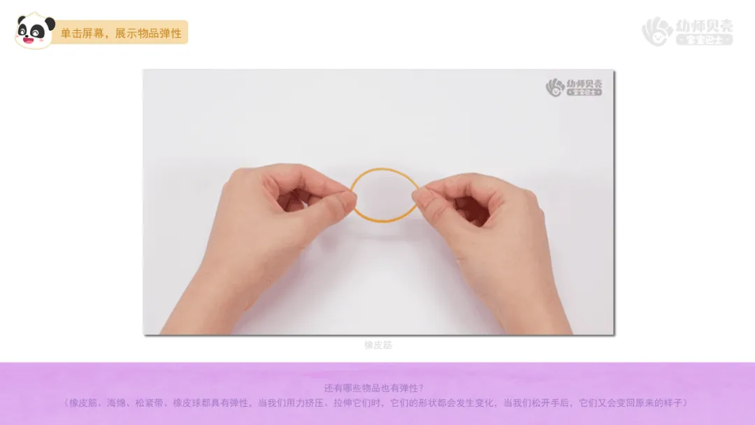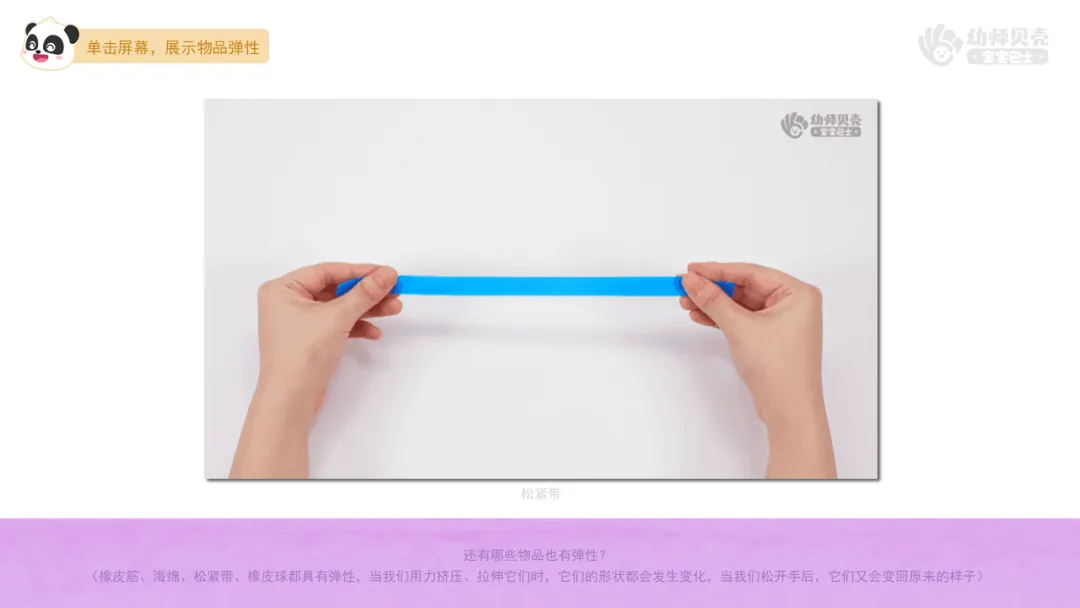 Ø活动建议:教师可以请幼儿在集体前展示自己找到的有弹性的物品并试着说一说该物品的弹性带来的好处。