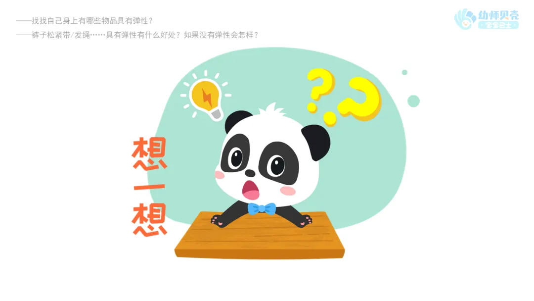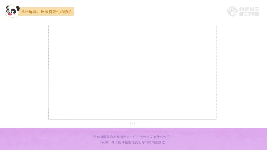 小结:裤子松紧带的弹性能帮助我们穿好裤子;衣服、袜子的弹性能让我们穿的时候更舒适;发绳的弹性能让我们扎紧头发;坐垫、沙发、床垫有弹性坐着会更舒服……弹性给我们的生活带来了许多好处。(教师根据幼儿实际情况调整小结)