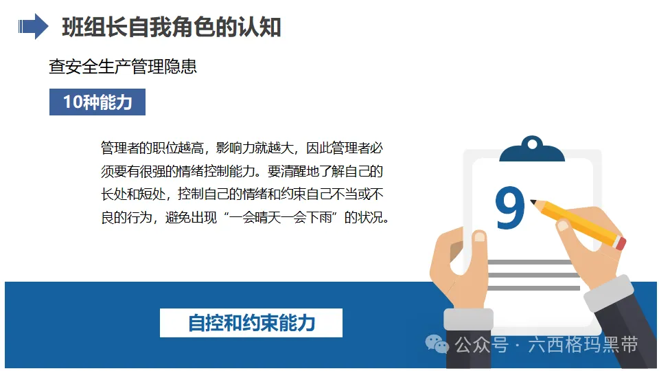 自控和约束能力:班组长作为团队的榜样和楷模,需要具备良好的自控和约束能力。他们需要时刻保持冷静和理智,不被情绪和外界因素所干扰,做到言行一致、以身作则,为团队成员树立良好的榜样。