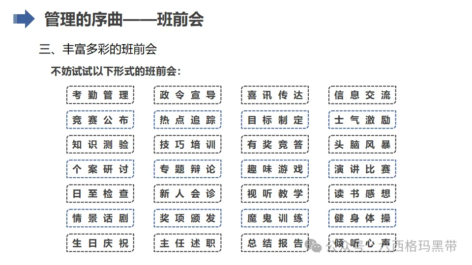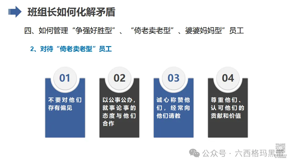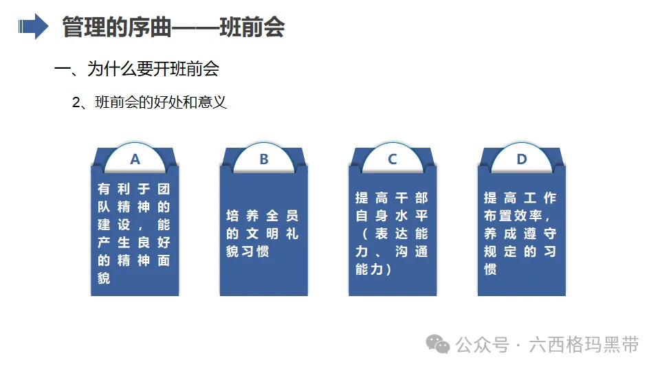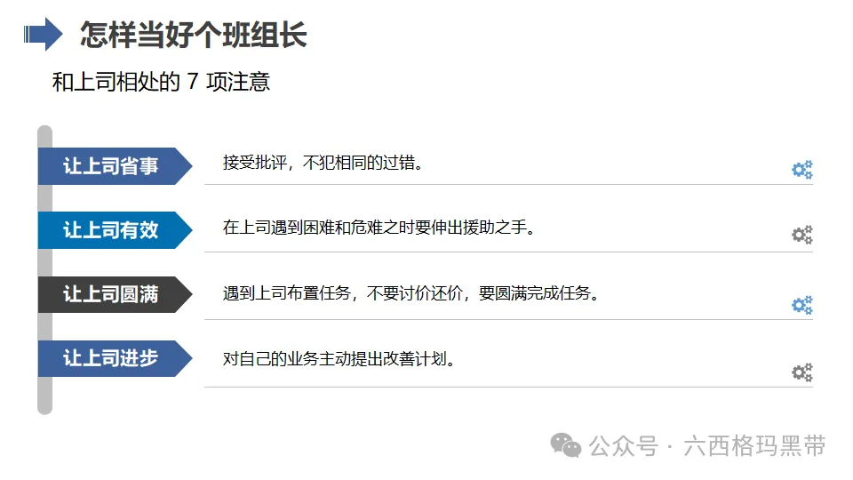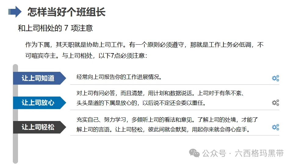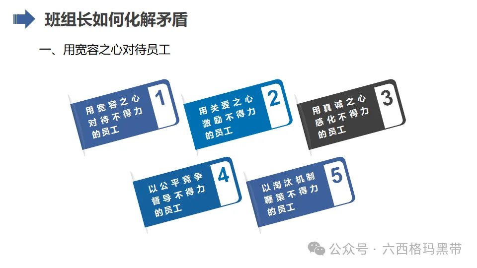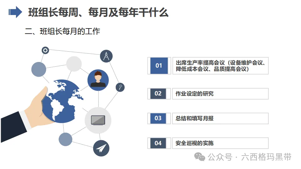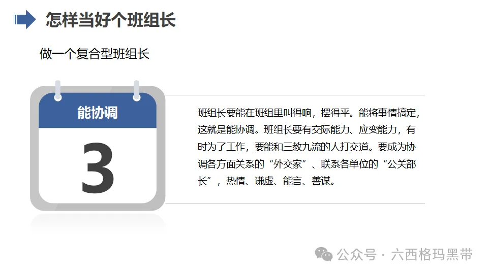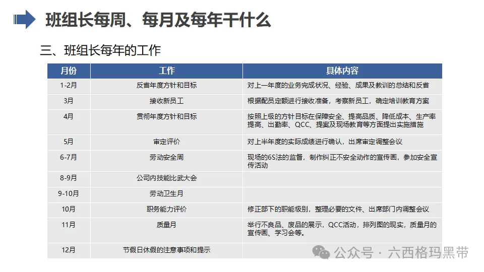 - 支持者:班组长应成为员工的坚强后盾,为员工提供良好的工作环境和条件,关心员工的生活和工作状态,增强员工的归属感和凝聚力。