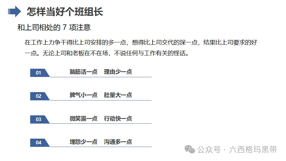 当好一名班组长,不仅需要扎实的专业技能和管理知识,更需要与员工和上司建立良好的关系,具备高度的责任心和使命感。以下从员工最重要的5点盼望、和上司相处的7项注意、挨上司骂时的9项修炼、班组长带兵的10个妙招,以及如何做一个复合型班组长和具备老板心态等方面,详细阐述如何当好班组长。