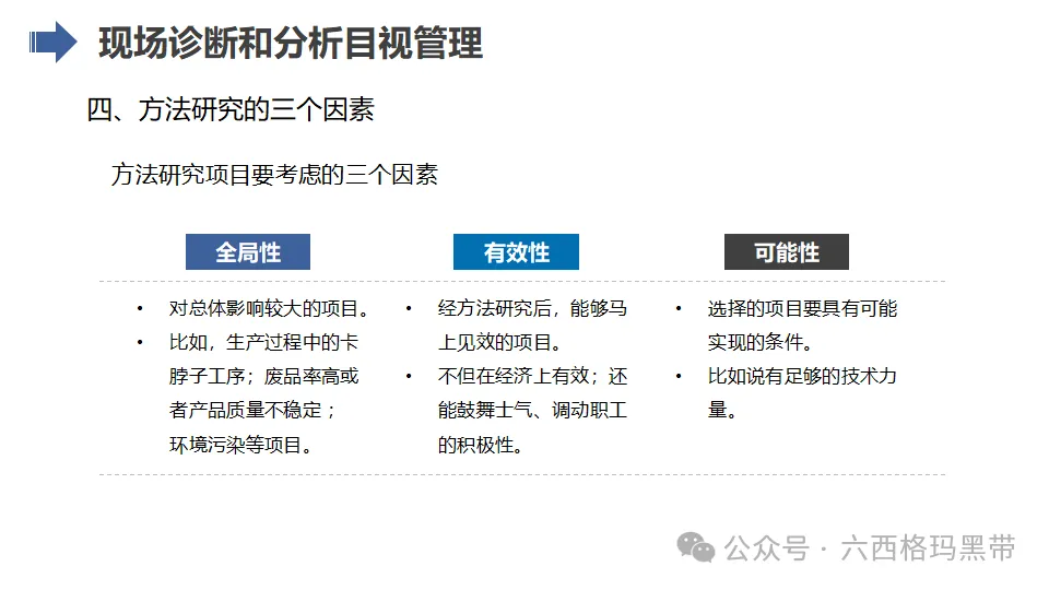 在进行现场管理的方法研究时,班组长应关注三个关键因素:人、机、料。即要研究如何合理安排人员、设备和物料,以实现最佳的生产效率。这包括人员的技能提升、设备的维护保养以及物料的精准管理等。