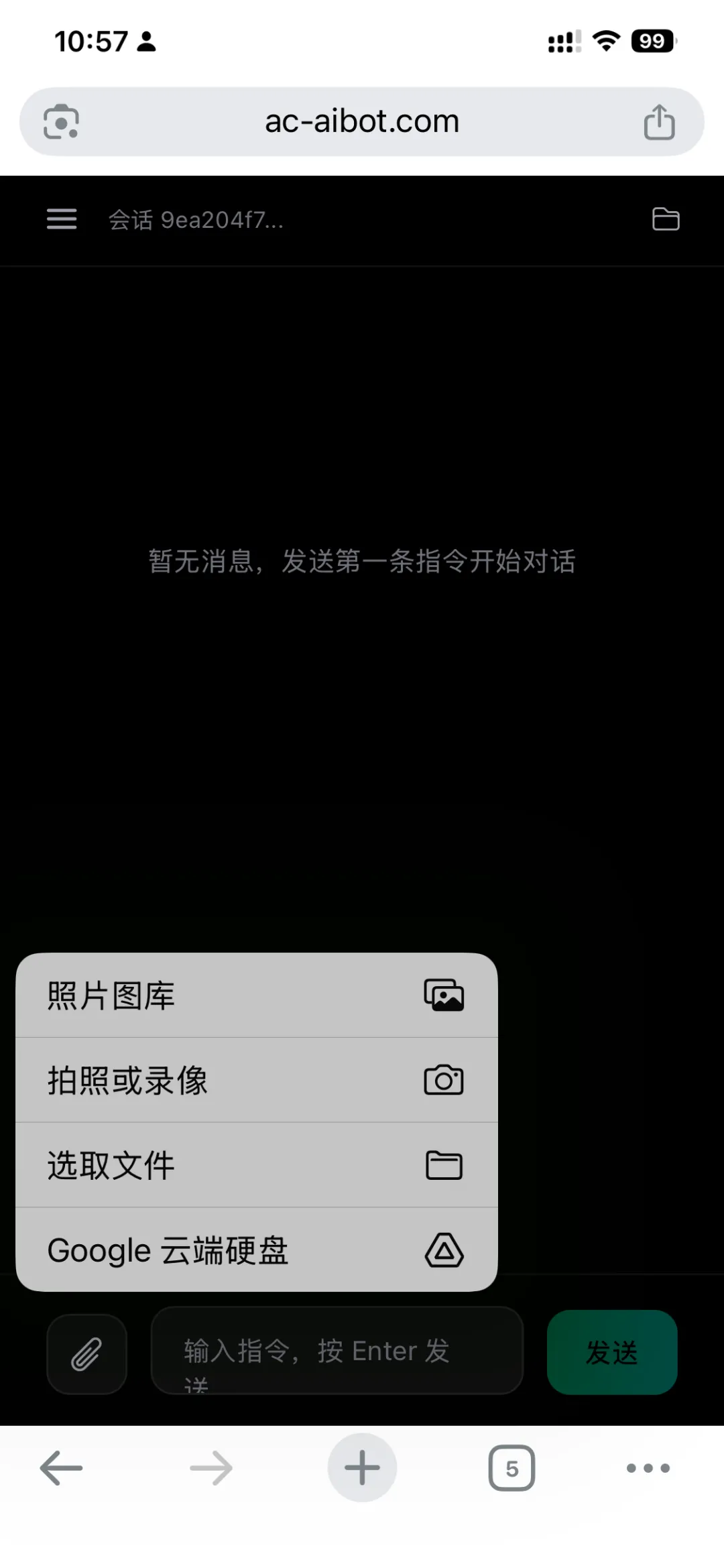 打开手机浏览器,访问 ac-aibot.com,进入对话界面。新对话的初始状态很干净——黑色背景,中间提示"暂无消息,发送第一条指令开始对话"。
