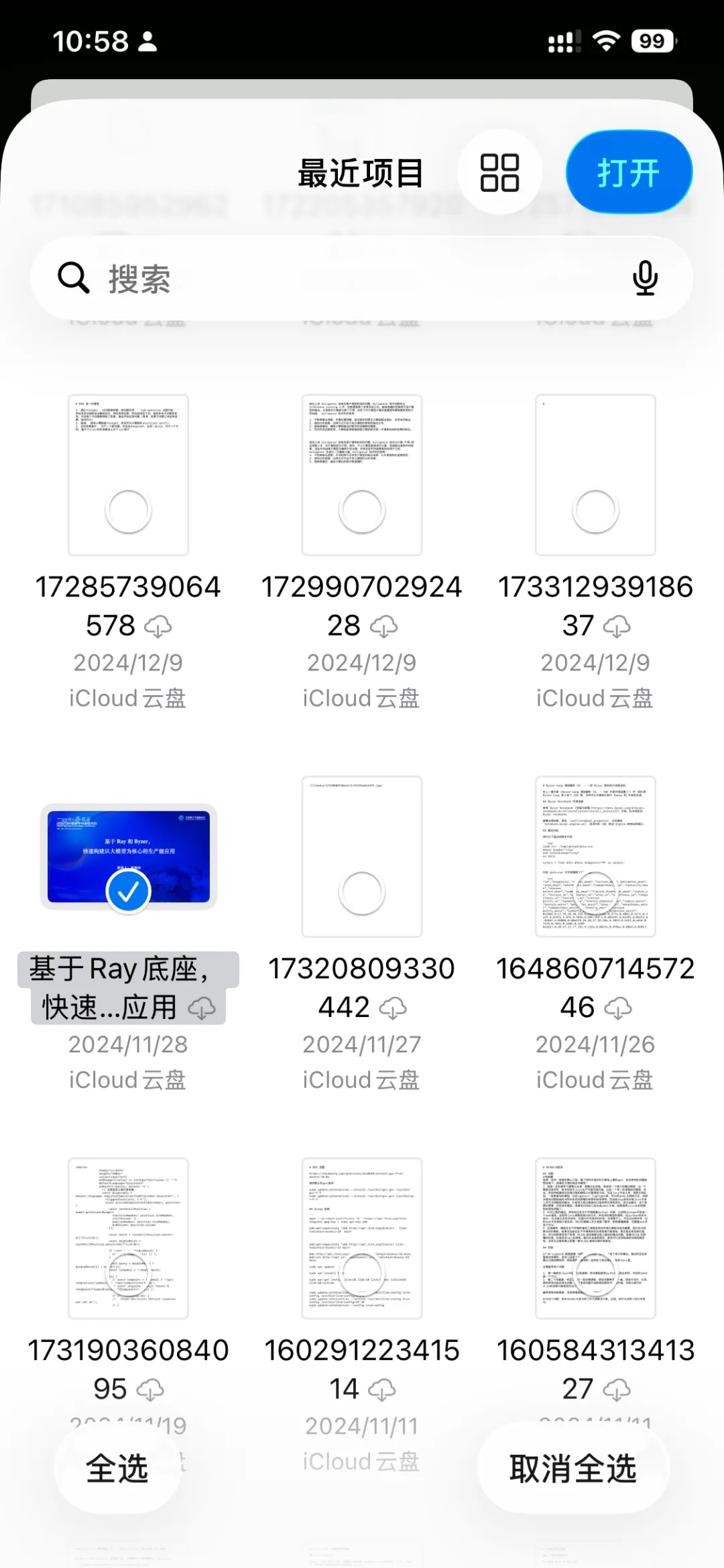 文件管理界面列出了最近的文件,PPT 存在 iCloud 云盘里,直接找到并选中——