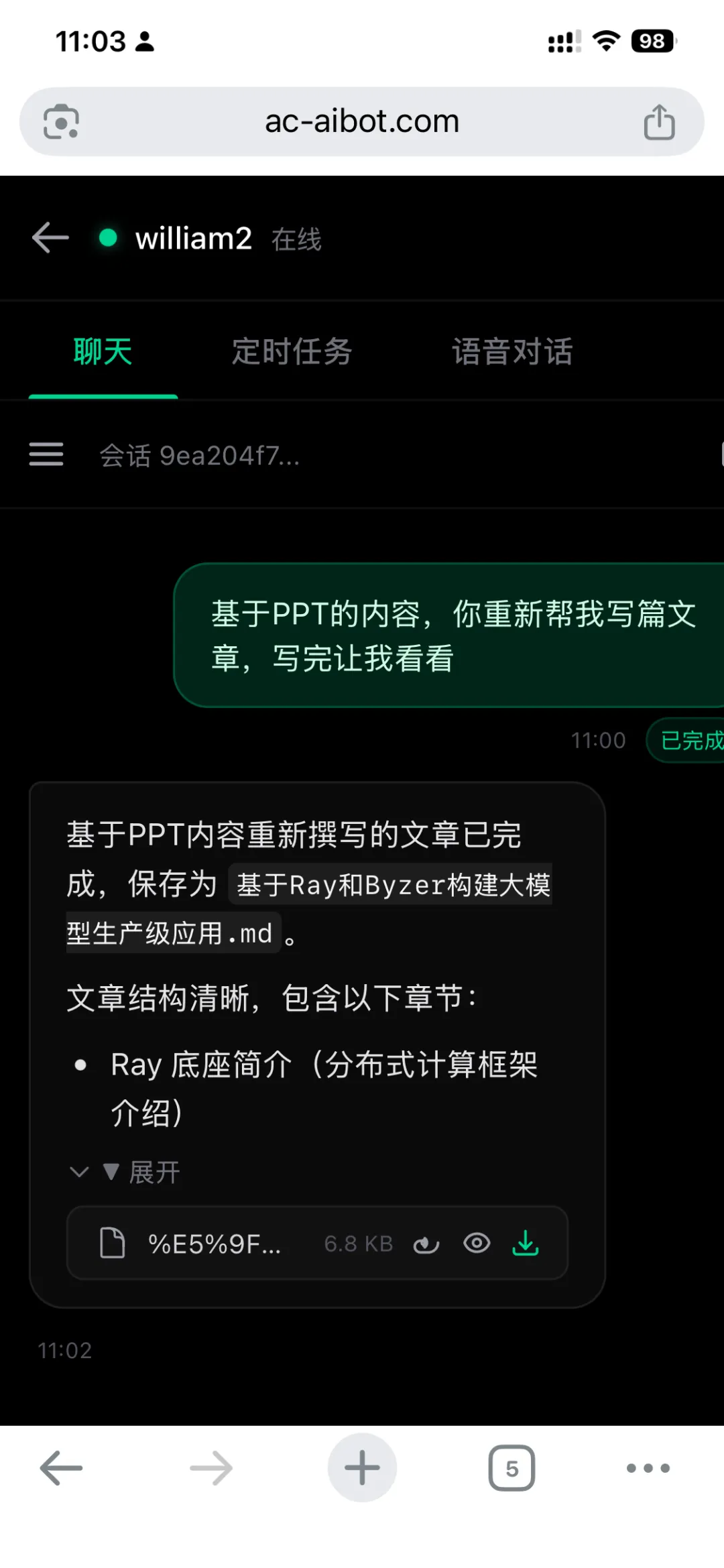 文章已写完,保存为"基于Ray和Byzer构建大模型生产级应用.md",并在对话中展示了文章结构