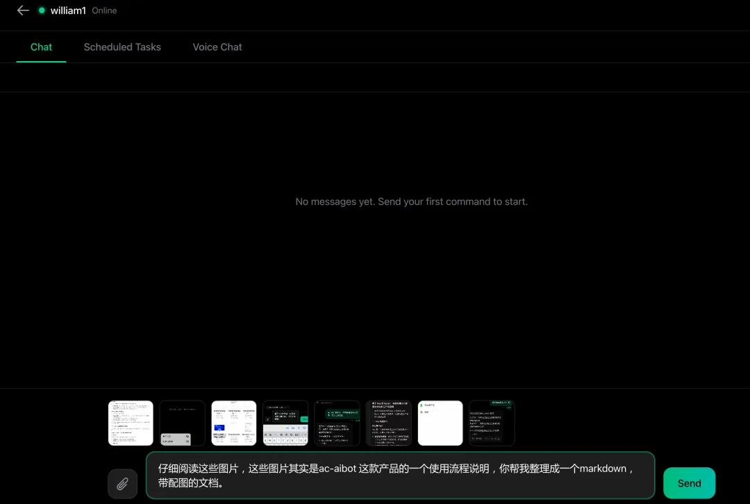 打开 AC-AIBot 的桌面版(william1 节点),新建对话,把 8 张截图全部上传,然后发出指令: