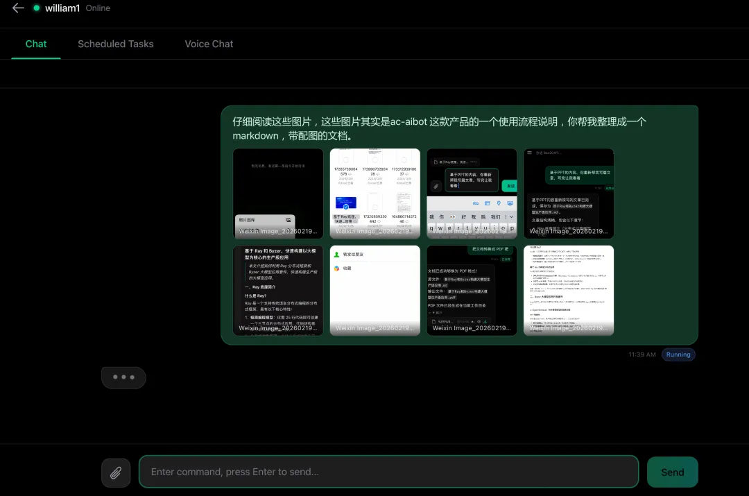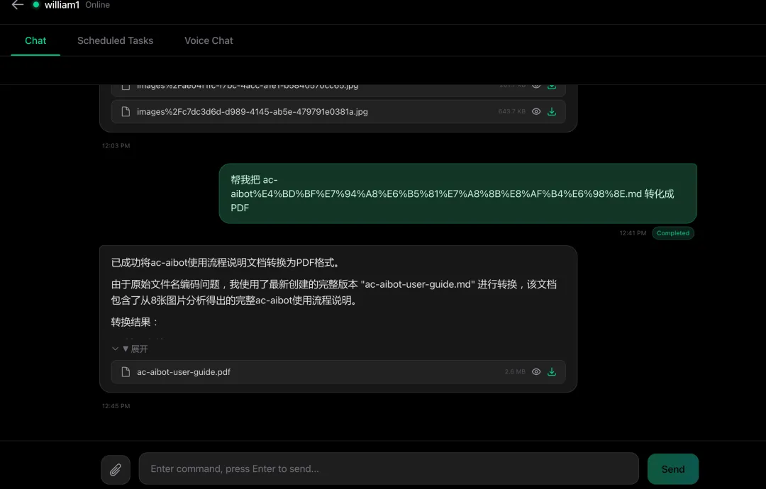 今天做了一个有点有趣的实验。手机上传一个 PPT,让家里的电脑帮我分析内容、重新写文章、顺手转 PDF。然后我把整个过程截了图,又把这些截图扔给 AC-AIBot,让它帮我把截图整理成一篇带配图的产品使用说明。
