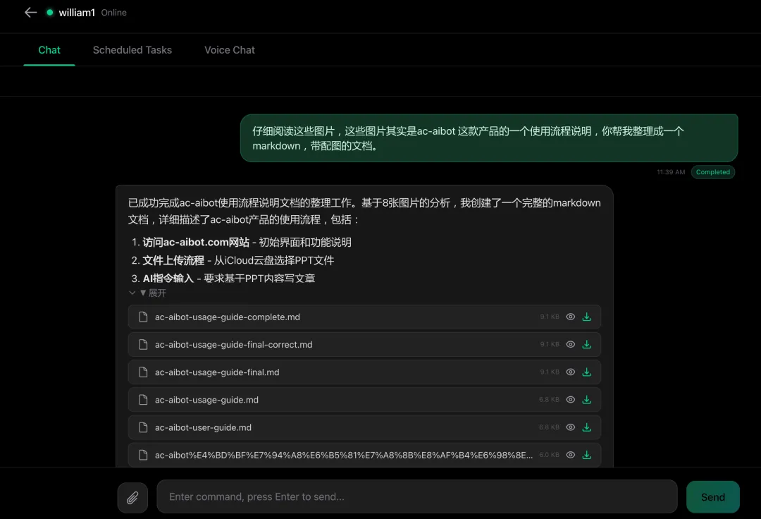 这就是 AC-AIBot 的本质——它不在乎你上传的是 PPT、是截图还是别的什么,它理解你的意图,然后调动电脑把事情做完。任何能被描述清楚的任务,都可以这样处理。