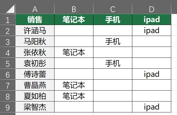 收到同事发来的表格,同一批产品名称分散在B、C、D三列,中间还夹杂着大量空格子,像下面这样: