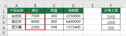 场景: 产品涨价,台式机+1400元,笔记本+1000元,显示器+500元。