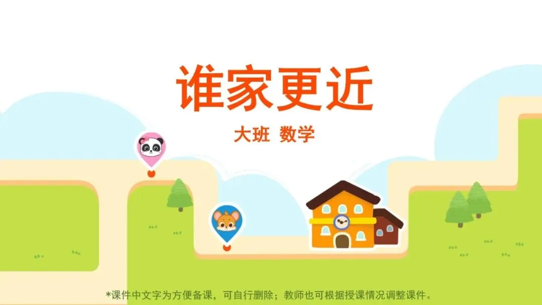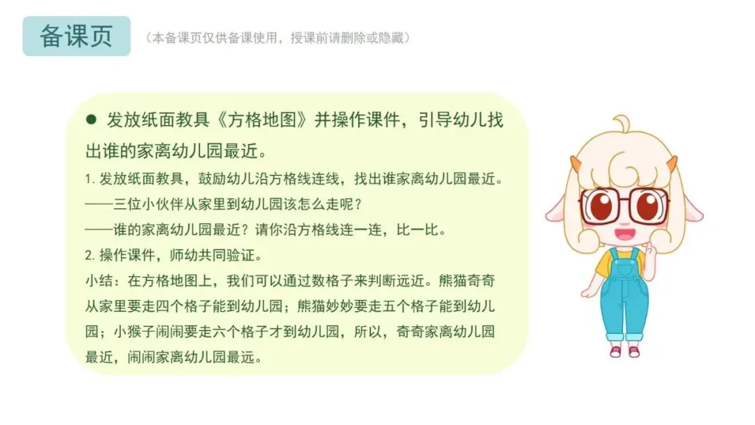 小结:在方格地图上,我们可以通过数格子来判断远近。熊猫奇奇从家里要走四个格子能到幼儿园;熊猫妙妙要走五个格子能到幼儿园;小猴子闹闹要走六个格子才到幼儿园,所以,奇奇家离幼儿园最近,闹闹家离幼儿园最远。