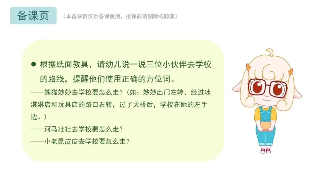 根据纸面教具,请幼儿说一说三位小朋友去学校的路线,提醒他们使用正确的方位词。