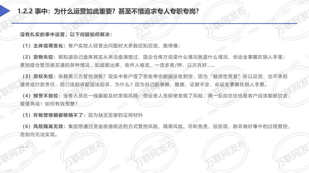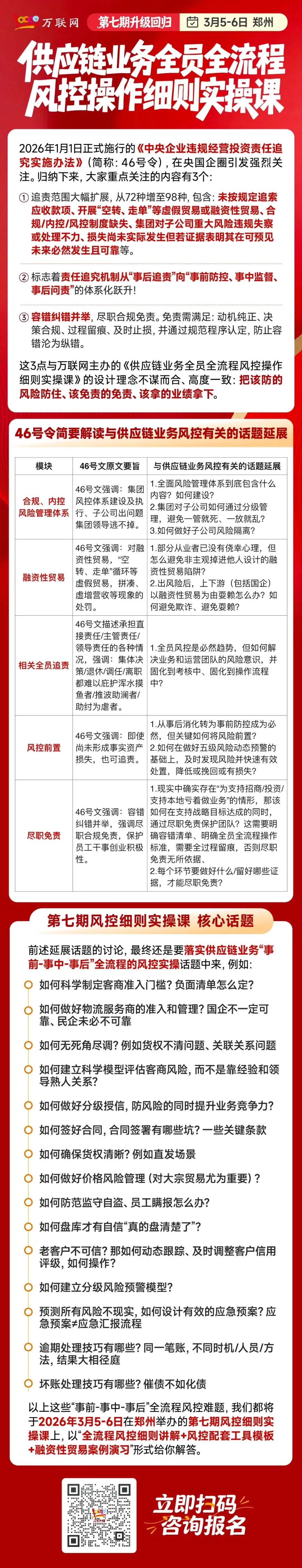 而到了第七期课程,我们更新迭代了不少内容,融合了46号令中大家尤为关注的合规与风险点,不仅有全流程风控细则讲解、风控配套工具模板,还有融资性贸易案例演习,万联网首席风险管理实战专家张洪江、万联网首席供应链业务法律风控专家张春艳,2位老师还会把46号令揉碎了、讲透了。不管你是想搞懂新规边界,还是想建立一套覆盖事前-事中-事后全流程、全员参与的供应链业务风控操作细则规范,这堂课都能帮你少走弯路、少踩坑。