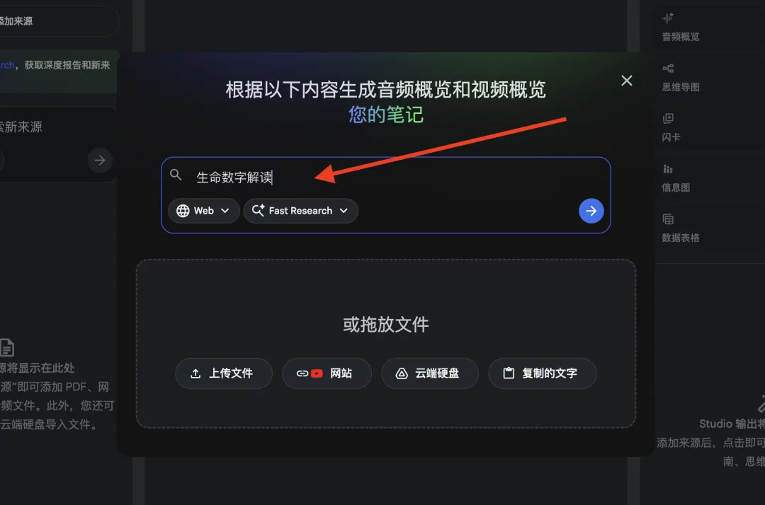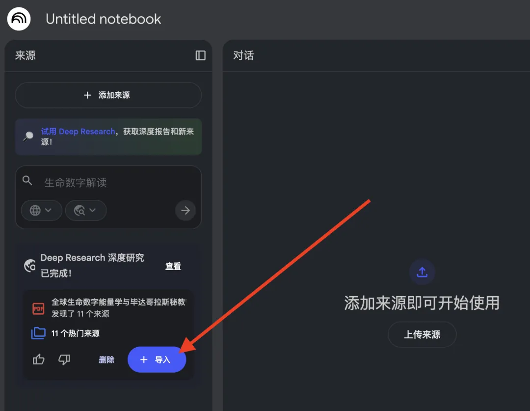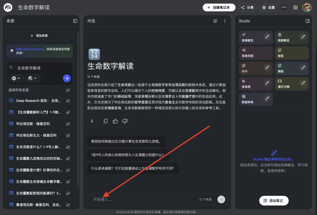 4、导入完成后,可以输入提示词,对这些来源进行分析、总结、内化学习。