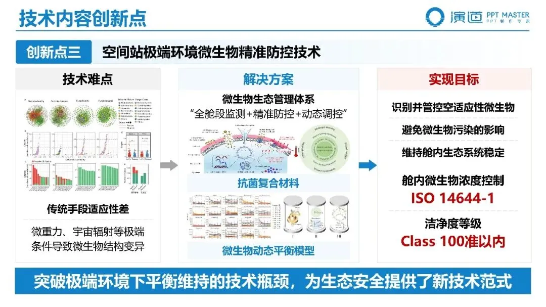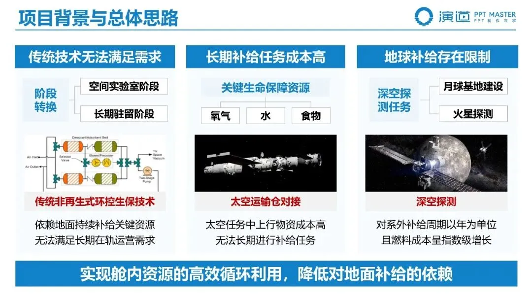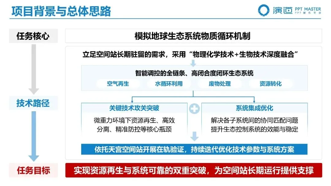 PPT 以 “项目背景 — 总体思路 — 技术创新” 为主线,先阐明深空探测与空间站长期驻留的资源瓶颈,再明确 “模拟地球生态循环、突破资源再生与系统可靠双重目标” 的技术路径,最后从空气再生、水资源回收两大维度展开创新突破,逻辑清晰、重点突出,充分体现科奖项目的战略价值与工程引领性。